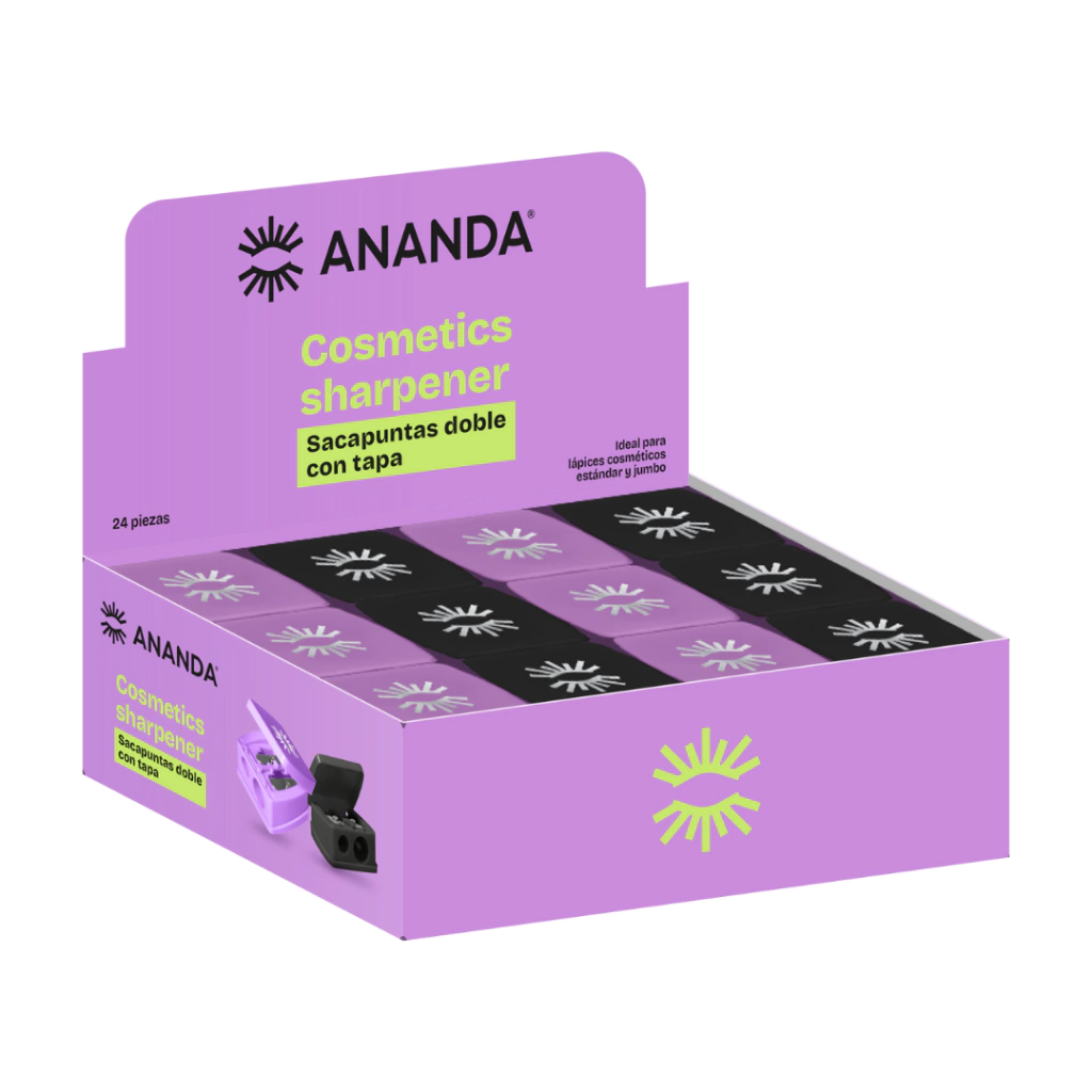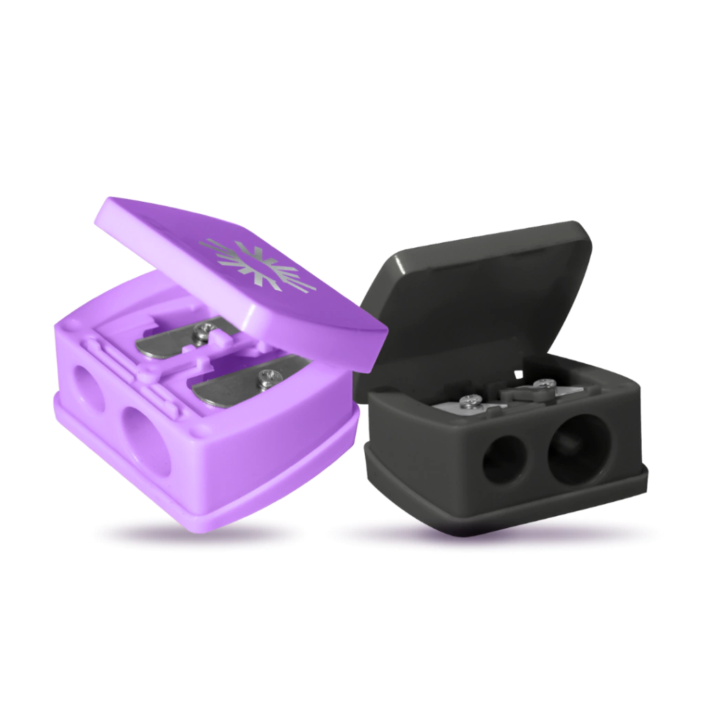 Contiene un sacapuntas doble con tapa, ideal para lápices de diferentes grosores.